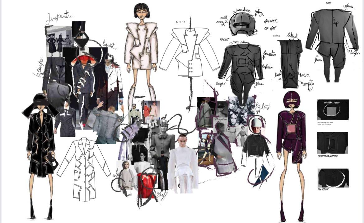 Fashion sketches, moodboard and work in progress for the collection "Perfect fict"