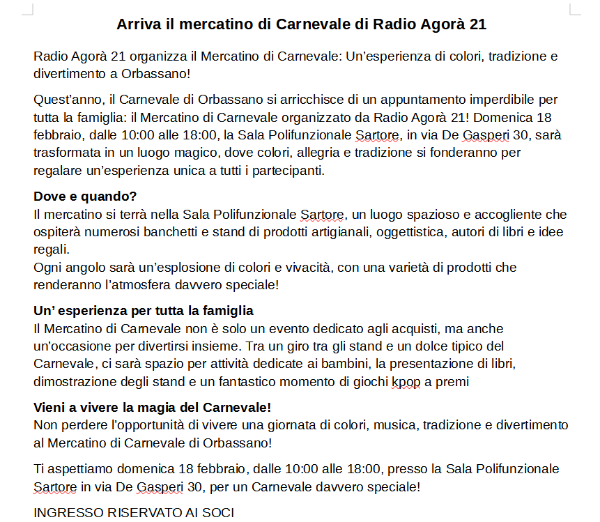 Articolo realizzato per un sito di una A.p.s. su un mercatino di carnevale