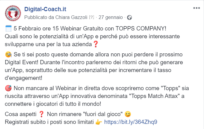 Copy sul canale facebook per promuovere il Webinar sulla nuova App della multinazionale Topps