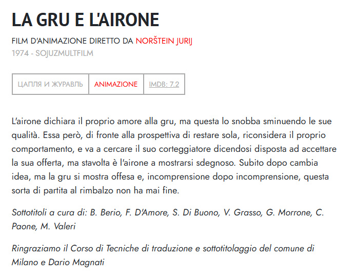 Traduzione e sottotitolaggio dal russo all’italiano del film d’animazione “La Gru e l’Airone” per il sito perestroika.it 2024