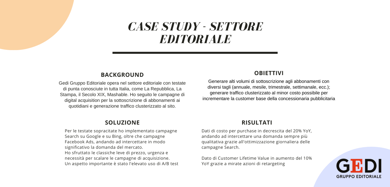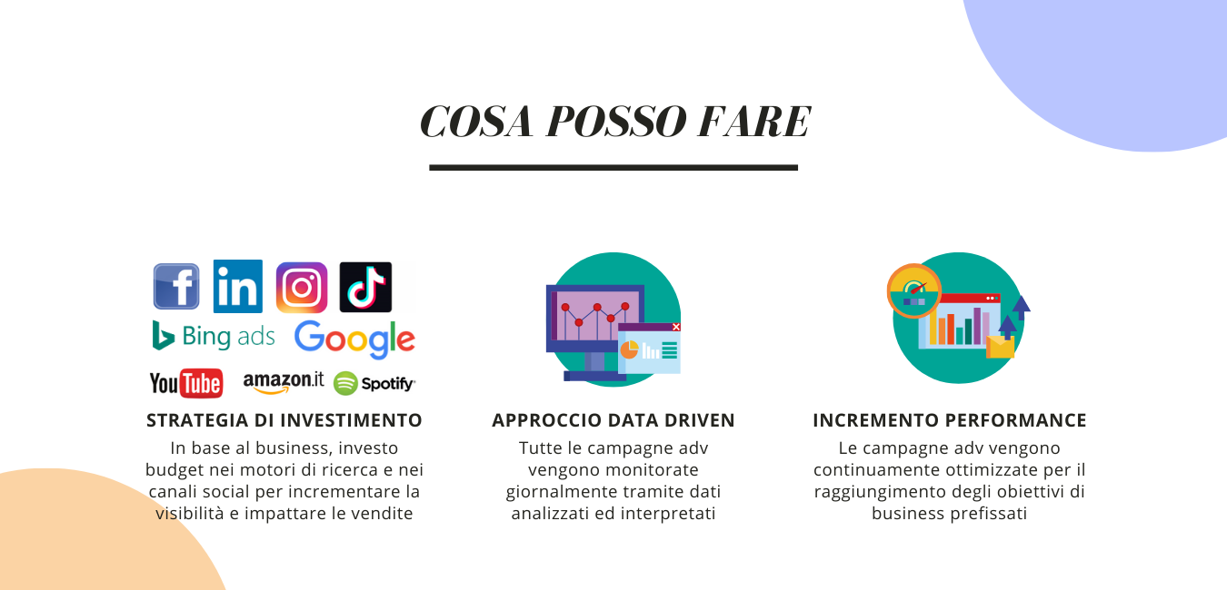 Sono un media buyer/performance marketer con 5 anni di esperienza. Facebook Ads, Google Ads, Bing Ads, LinkedIn Ads e E-commerce Ads sono il mio pane quotidiano. In media investo circa 2M € in Ads all'anno collaborando con clienti che operano in diversi settori, sia a livello locale sia nazionale ed internazionale, sia nel b2c che nel b2b.