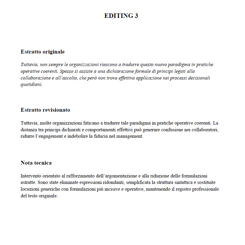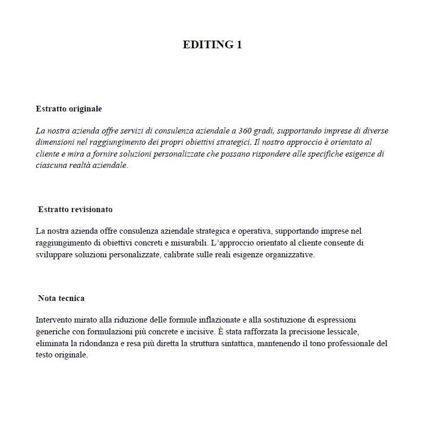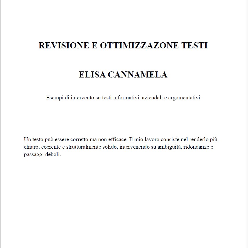 Intervengo su chiarezza, coerenza e struttura, eliminando ridondanze e formulazioni generiche e rafforzando la solidità logica del contenuto, senza alterare la voce dell’autore.