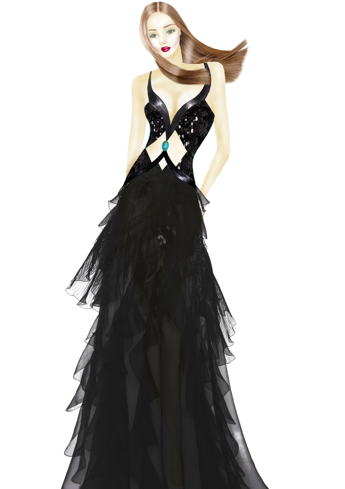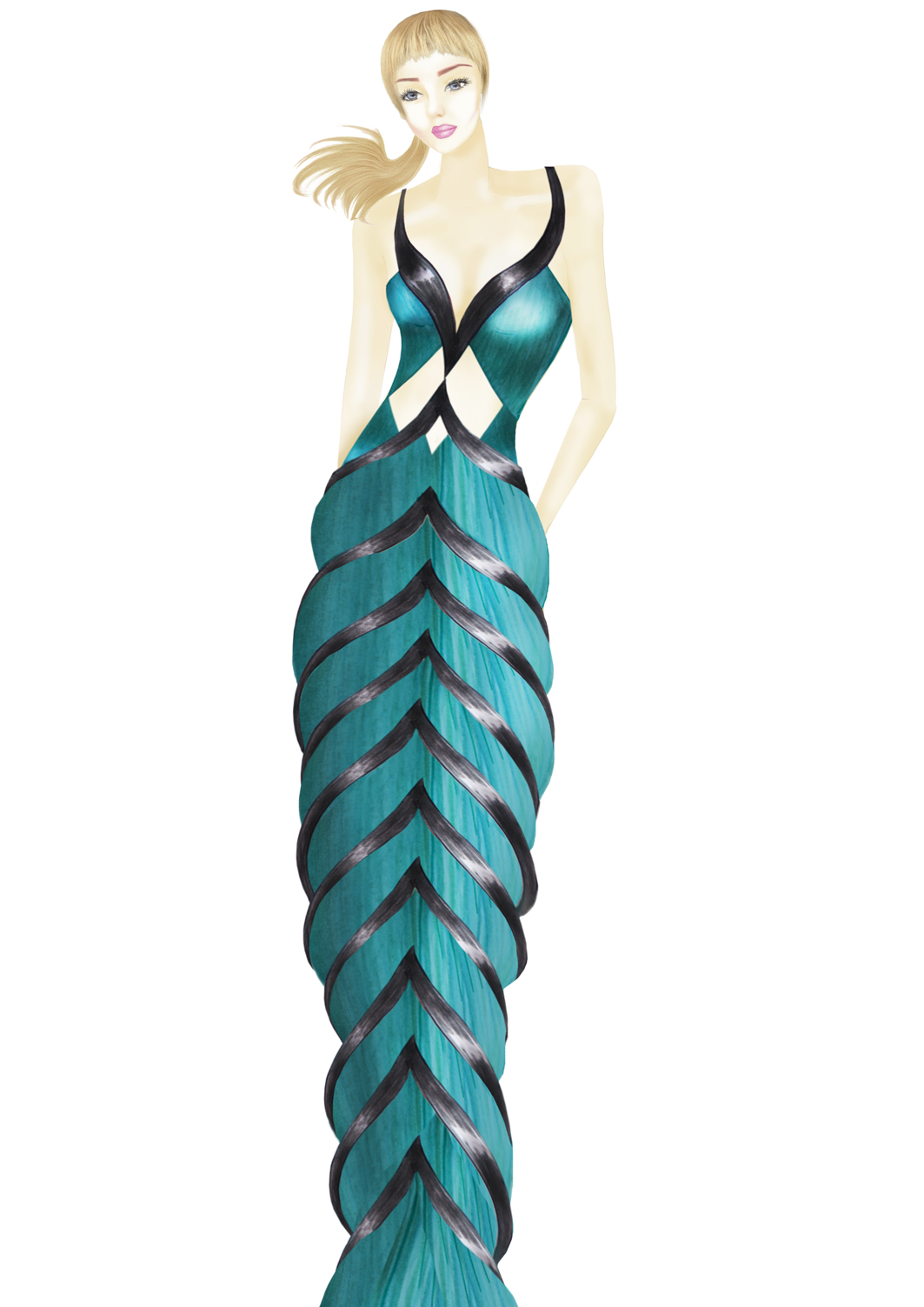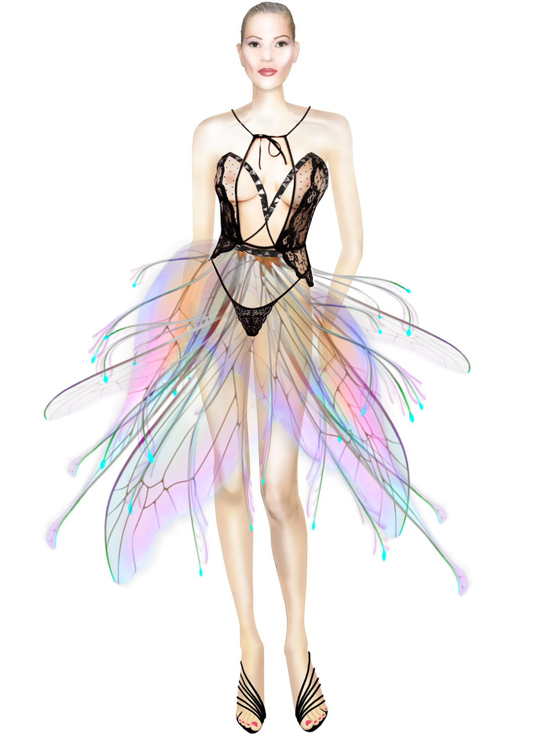 Figurino con viso di Kate Moss, interamente disegnato e colorato con photoshop che indossa un abito ideato da me ed ispirato alle ali di una libellula