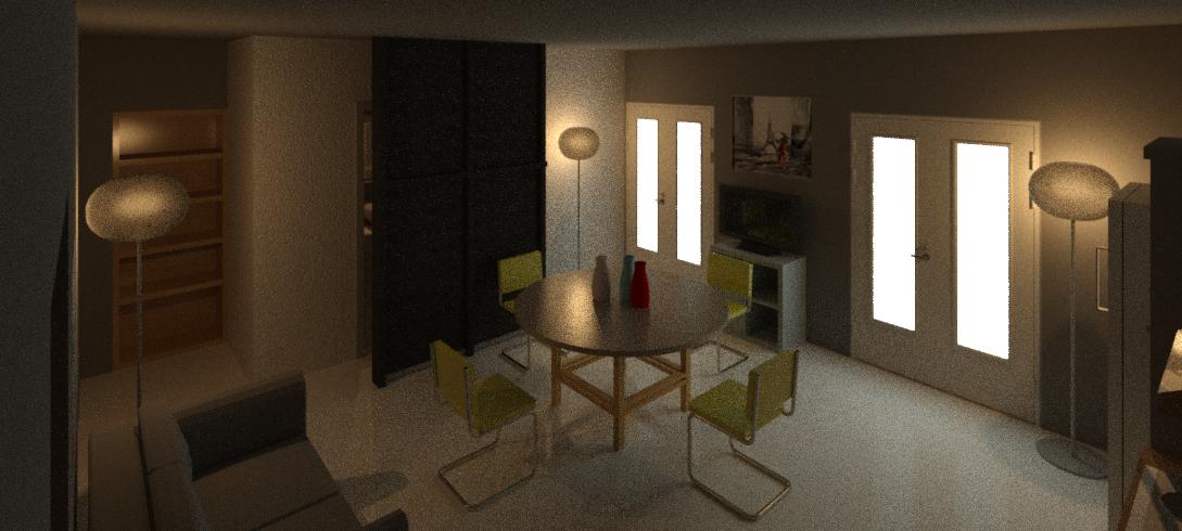 Progetto per la fusione di due unità immobiliari; Rendering della zona giorno.