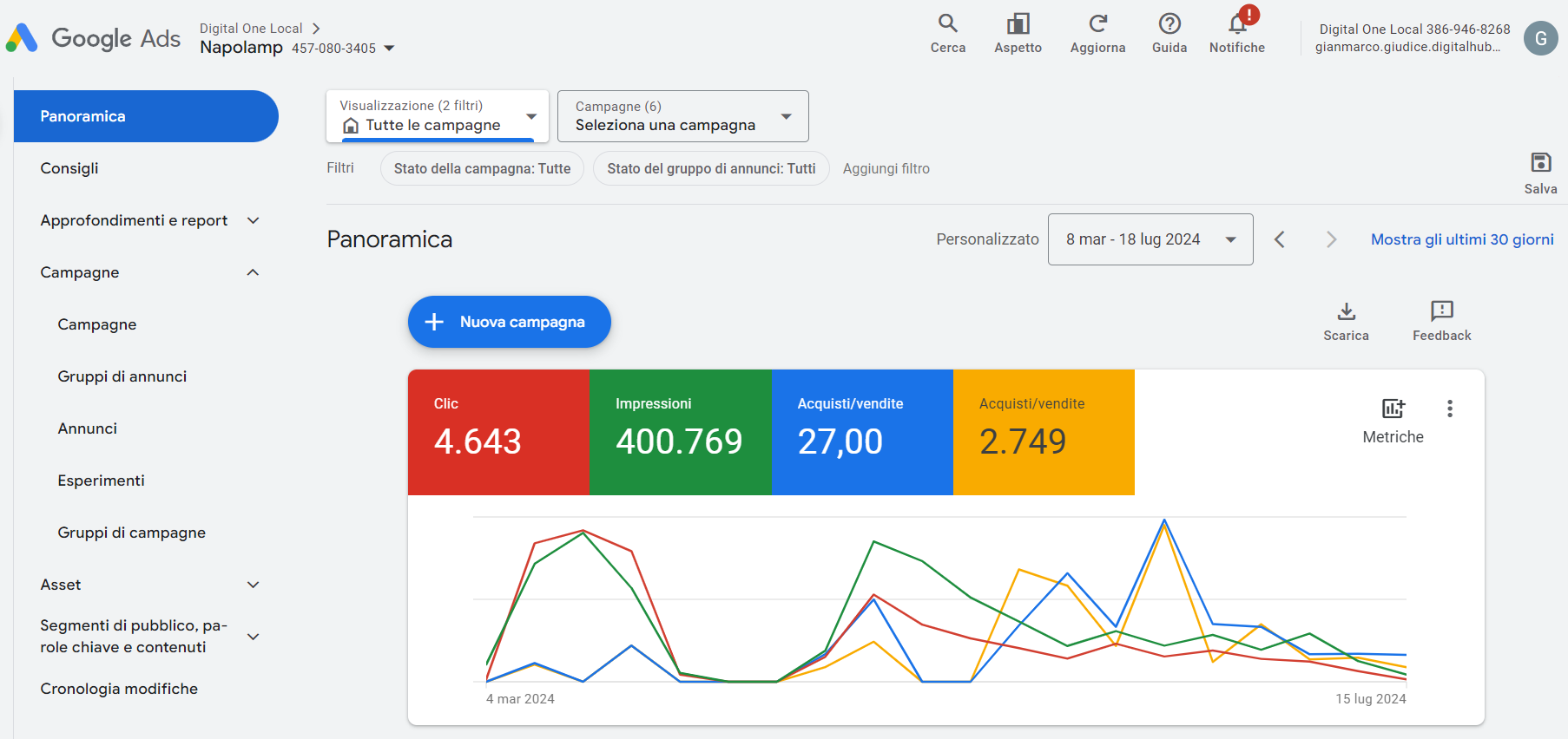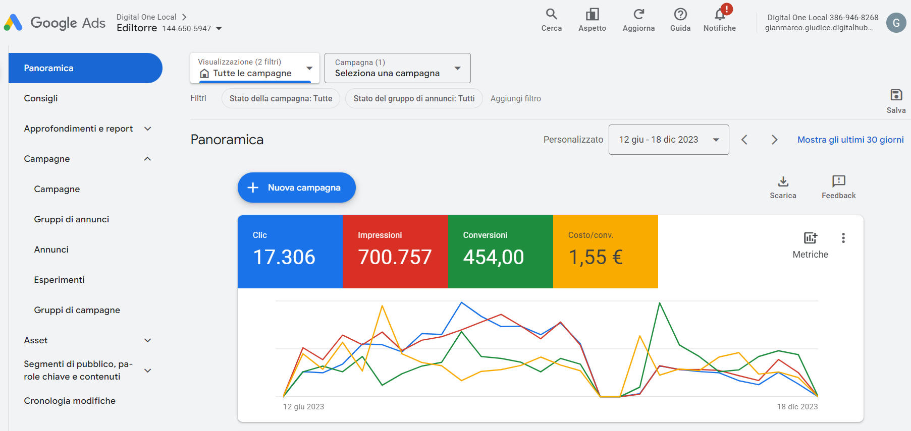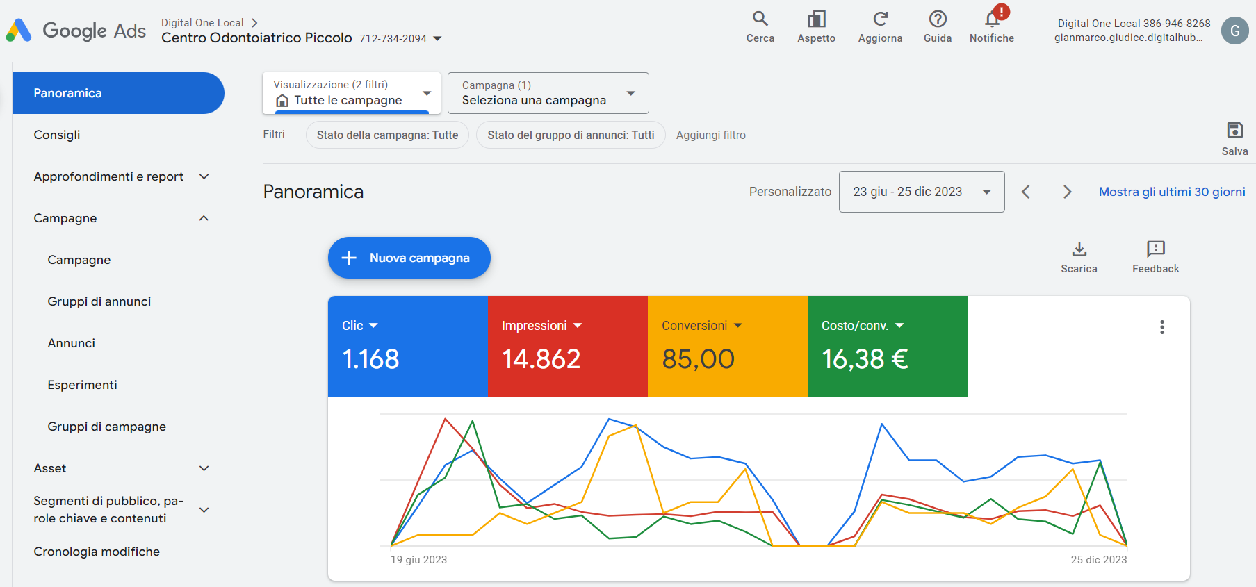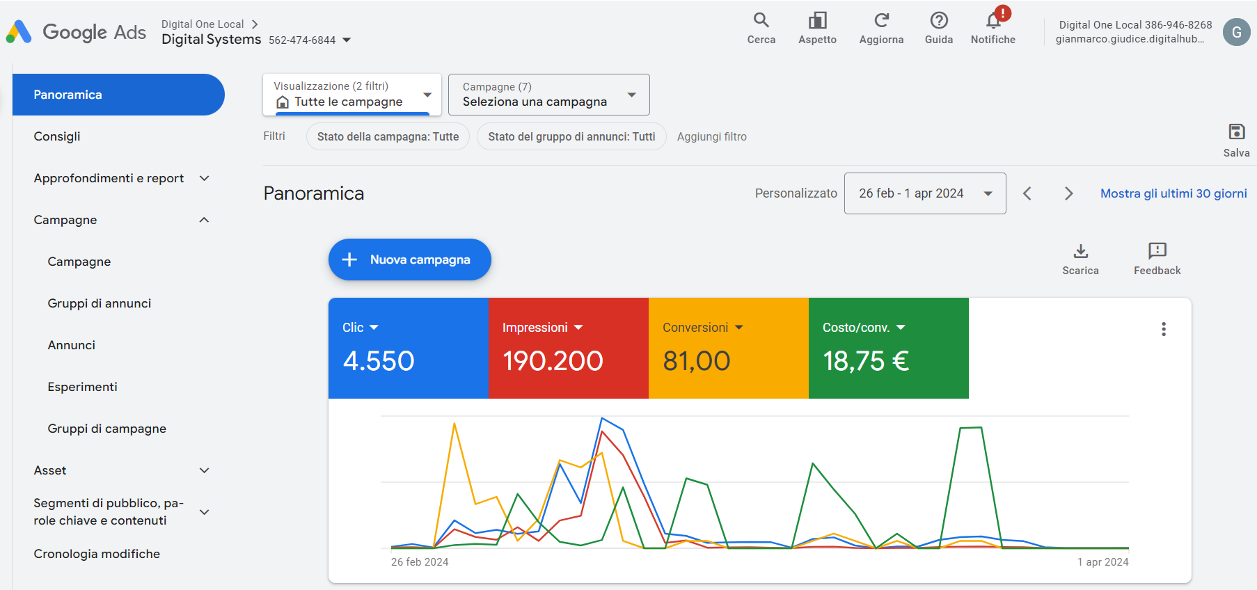 Campagne di ricerca, display, performance max finalizzate all'ottenimento di lead interessati all'installazione dell'impianto fotovoltaico.