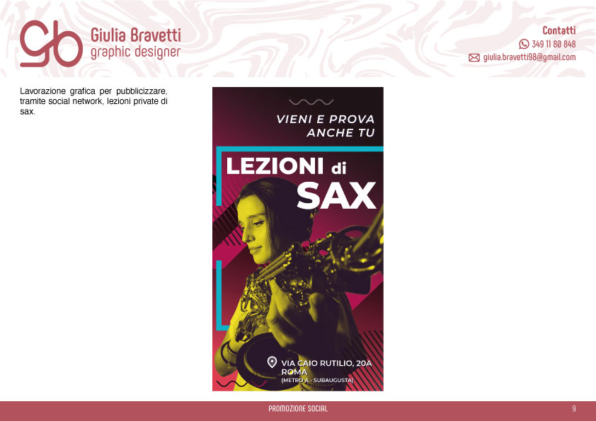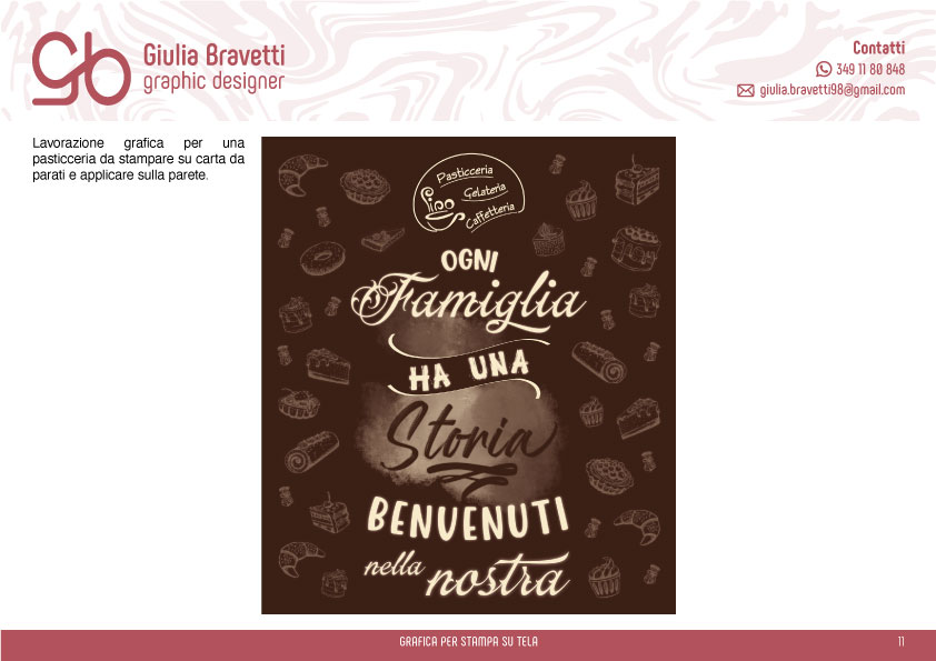 Sono una graphic designer, diplomata in grafica pubblicitaria nel 2016 presso il Liceo Artistico "Giulio Carlo Argan". Dal 2017 lavoro in una tipografia dove mi occupo della ideazione e progettazione di materiale grafico, tra cui: locandine, volantini, brochure, pieghevoli, manifesti, banner e partecipazioni.