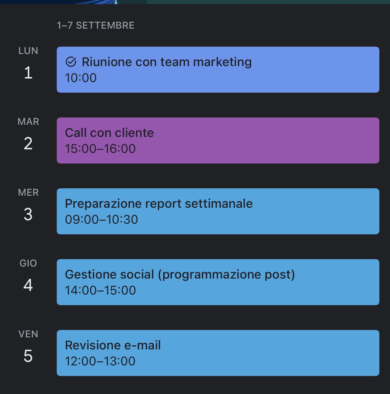 Esempio dimostrativo di organizzazione calendario settimanale per un cliente, con riunioni, call, gestione email e attività social. Mostra la mia capacità di pianificare e gest ..