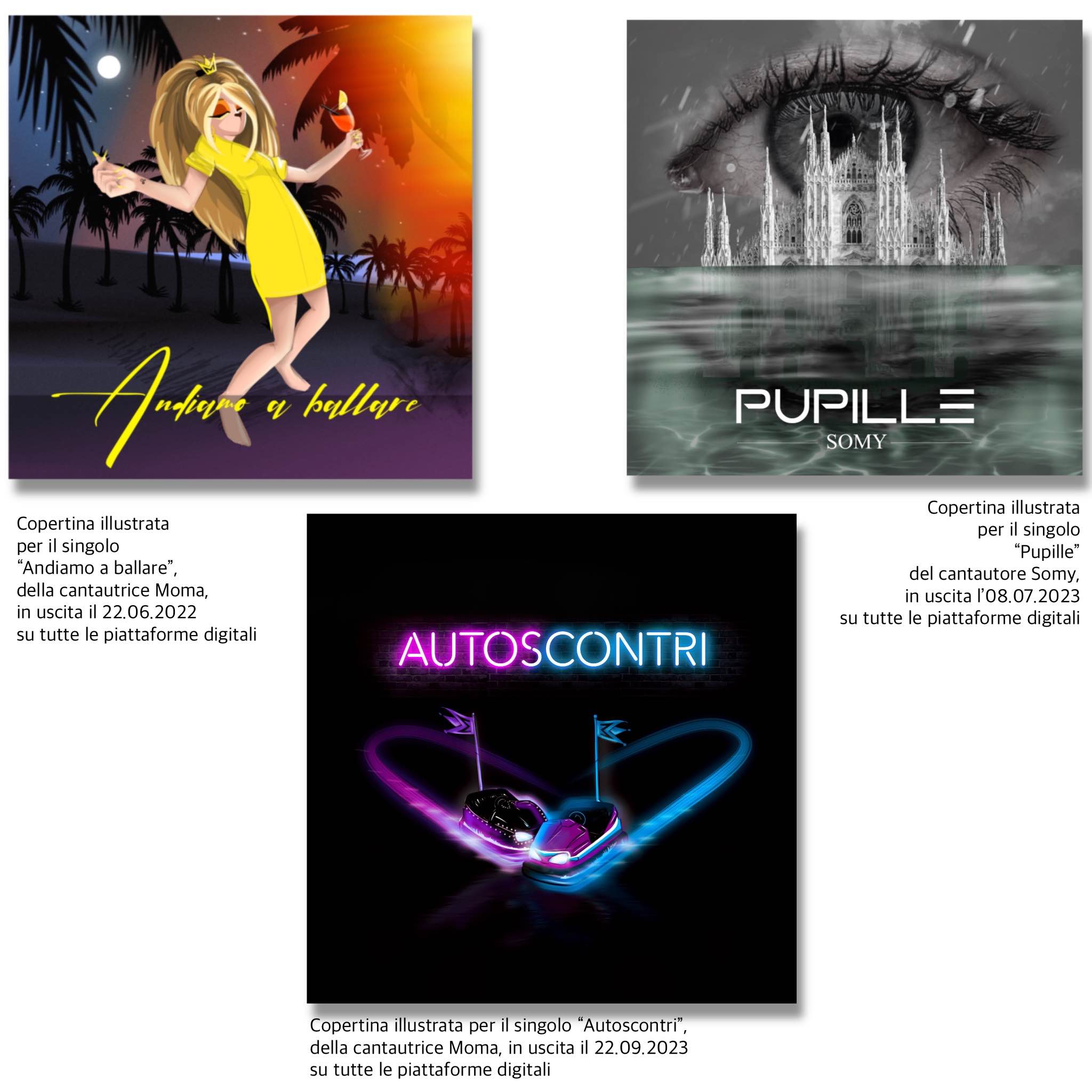 Copertine illustrate realizzate per singoli musicali pubblicati sul tutte le piattaforme digitali anche attraverso etichetta discografica.