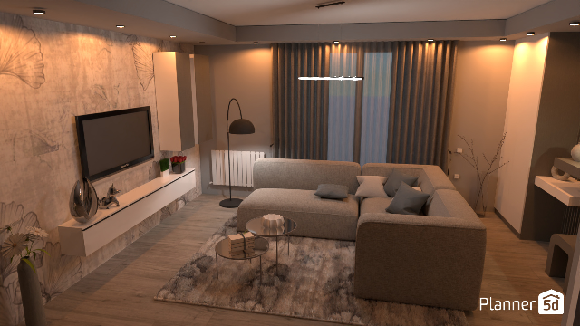Progetto di interior design realizzato con Planner 5D. Un soggiorno moderno dai toni caldi e neutri, con arredi eleganti, illuminazione soffusa e composizione funzionale. Lo spazio è pens ..