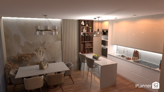 Progetto cucina open space con zona pranzo, creato su Planner 5D. Design moderno con isola centrale, pareti chiare, illuminazione a LED e dettagli naturali. L’ambiente è pensato ..