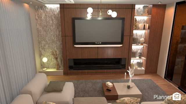Living elegante progettato con Planner 5D. Toni caldi, parete attrezzata in legno, illuminazione integrata e divano chiaro creano un ambiente raffinato e accogliente. Ogni elemento è stud ..
