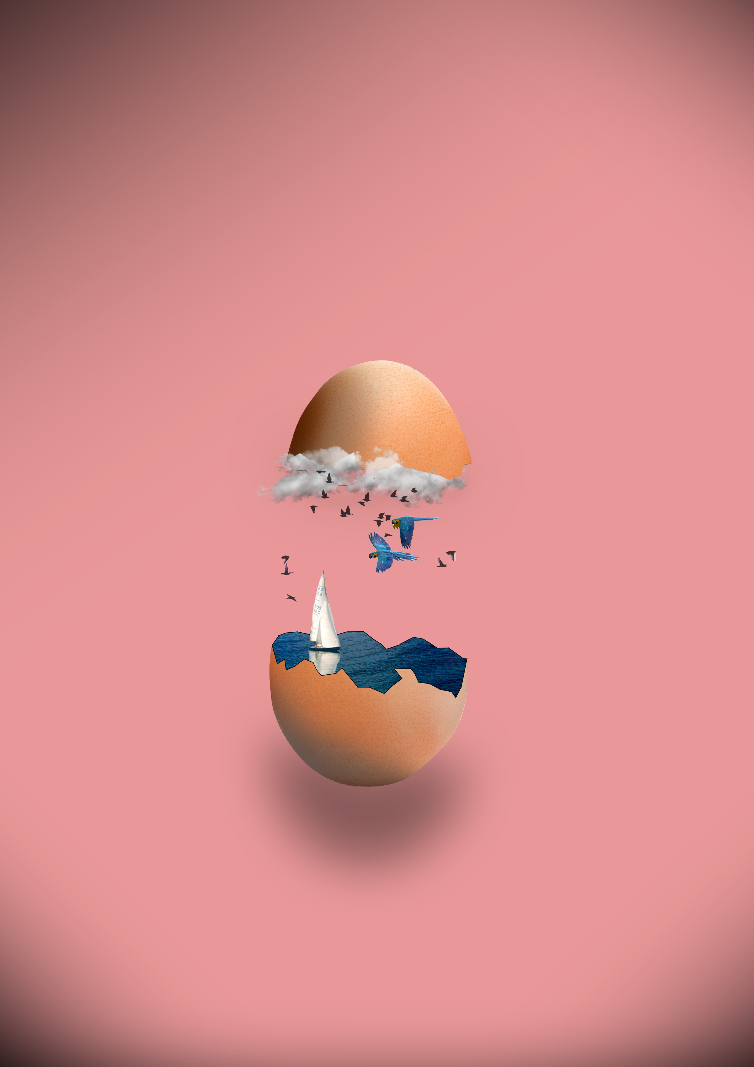 Il poster mostra un uovo rotto a metà. Dentro l’uovo c’è un mare calmo con una barca a vela che naviga. Sopra il mare, nel cielo dentro l’uovo, vo ..
