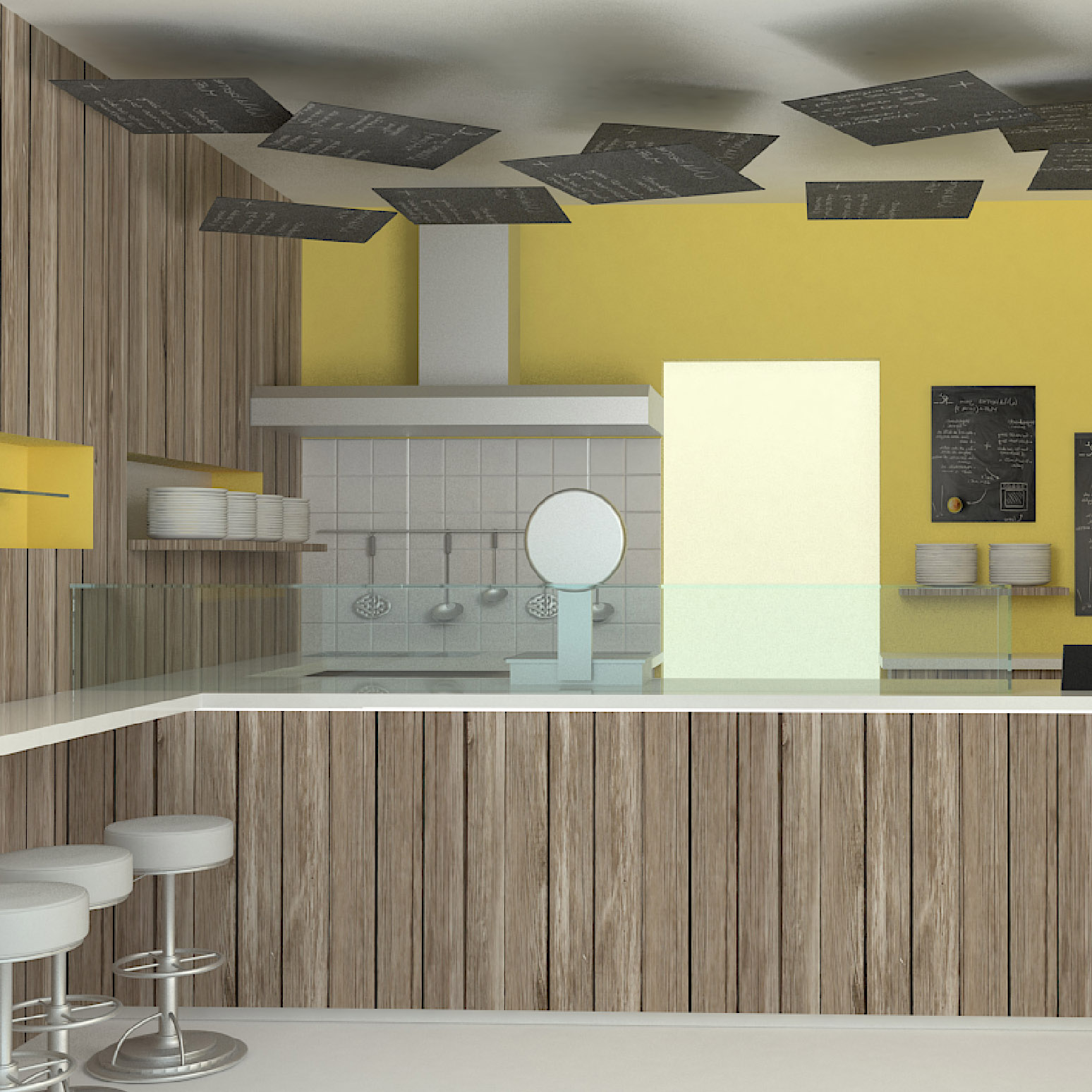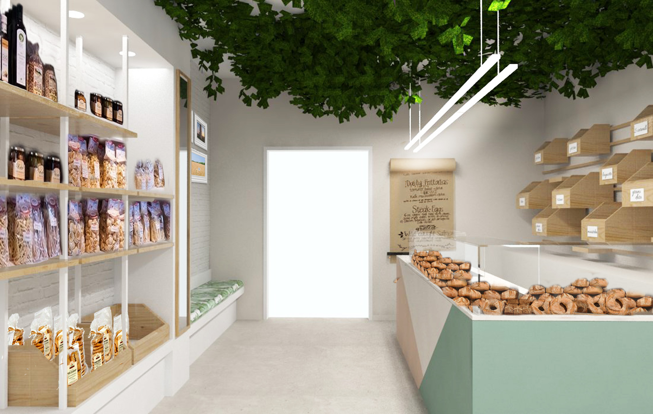 Progettazione di una panetteria con un design fresco e alternativo, con soffitto verde e uso di materiali naturali