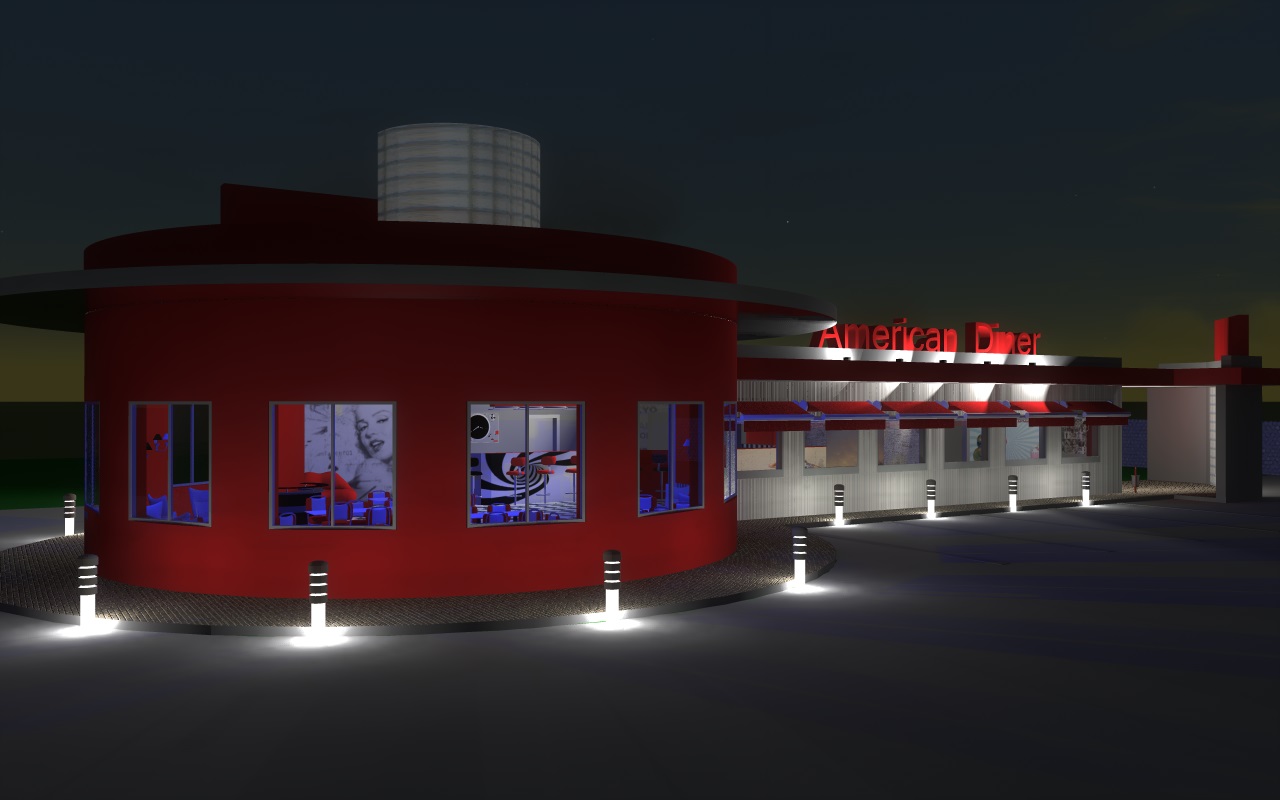 Arredo interno American Diner, vista dall`esterno.