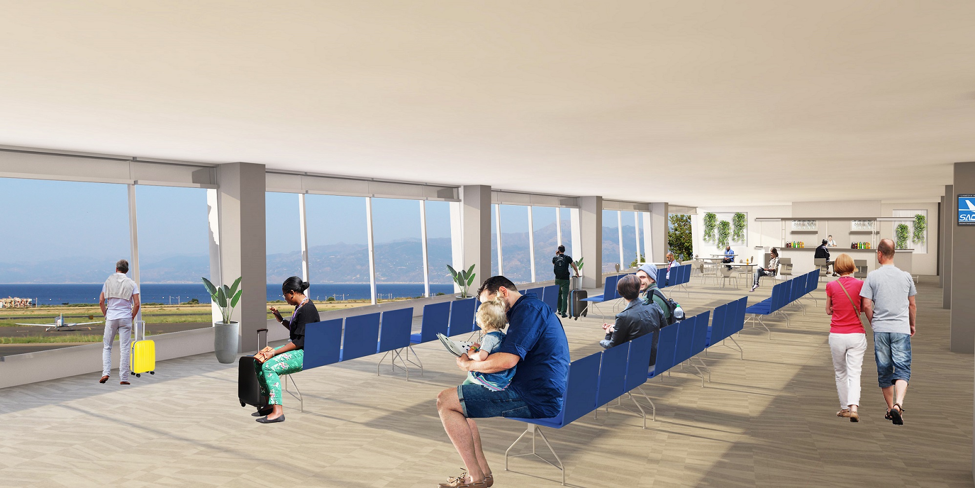 Proposta di progetto per la riqualificazione dell´Aeroporto dello Stretto. Interno, sala d´attesa lato pista.