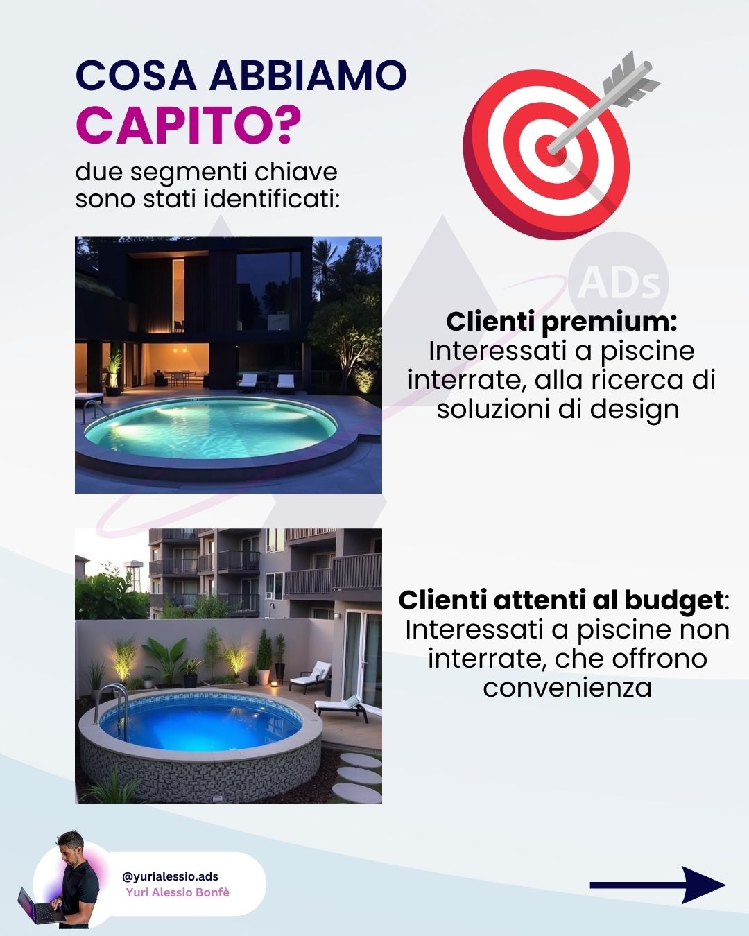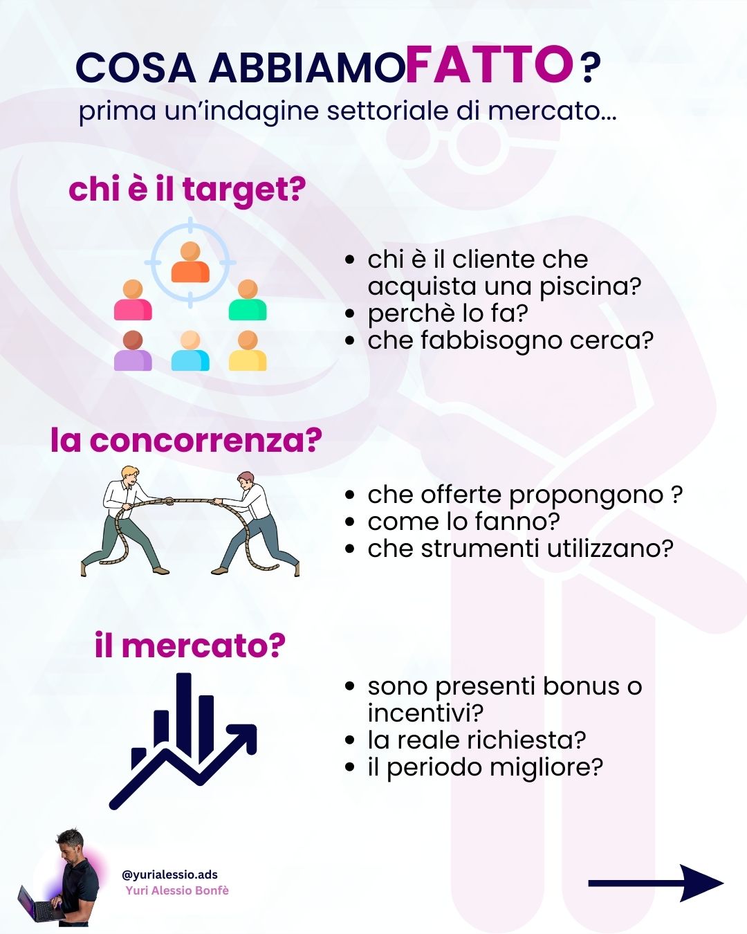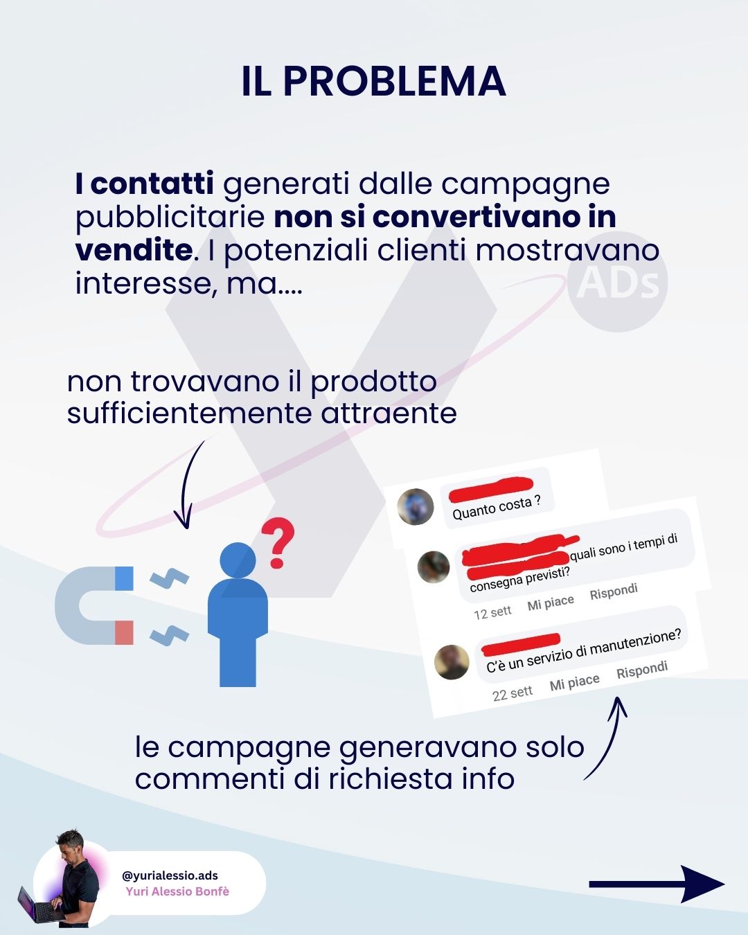 Sono Yuri Alessio e lavoro nel marketing digitale. Sono preciso e attento ai dettagli: non mi limito a creare campagne standard, ma costruisco strategie su misura, pensate apposta per parlare direttamente al pubblico che vuoi raggiungere.